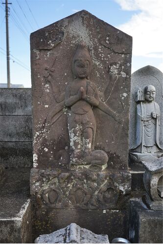 東京都足立区日ノ出町の清亮寺(探訪日:2023年8月17日)山門寺号標。日蓮宗寺院お馴染みの髭題目が刻まれています。「久榮山」扁額本堂 本堂側から墓地に入り、やや進んだ場所に庚申塔が建っています。青面金剛像庚申塔 刻銘「(銘不詳)」 御尊容(立像、一…