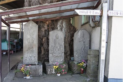 千葉県市川市下貝塚2丁目の路傍(訪問日:2024年3月16日)個人宅のガレージ脇にトタン屋根を伴って3基の庚申塔が置かれています。市川市教育委員会設置の標柱によると、通称「木戸口庚申塔」だそうです。向かって左の文字塔から載せます。文字庚申塔 刻銘「…