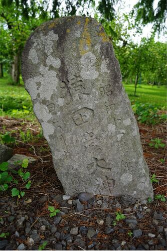 青森県北津軽郡鶴田町中野字北元の路傍(訪問日:2024年9月2日)旧道沿い、三叉路に地蔵堂と並んで2基の庚申塔があります。写真中央のものから掲載します。文字庚申塔(猿田彦大神塔)① 刻銘「昭和十一丙子年旧六月十九日(1936) / 村中 / 猿田彦大神」 隅丸…
