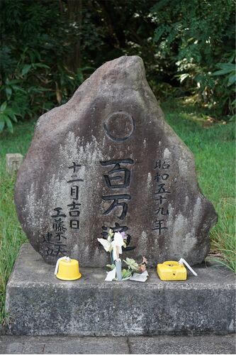 青森県西津軽郡鰺ヶ沢町深谷町字細ケ平の路傍(訪問日:令和5年9月17日) 鰺ヶ沢町立旧深谷小学校の入り口前、地蔵堂の手前に小ぶりの百万遍塔が置かれています。刻字が浅いため判読が難しかったです。 百万遍供養塔(百万遍塔) 刻銘「□□二年□〜□ / 百万遍…