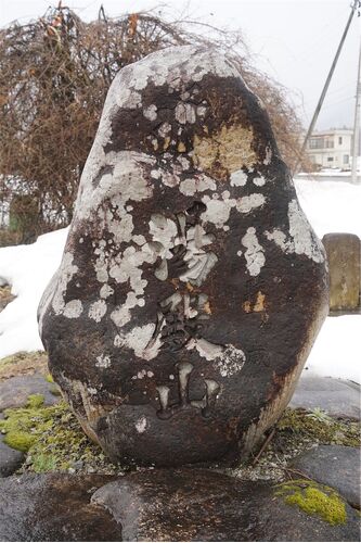 山形県西置賜郡白鷹町高岡1033の路傍(訪問日:令和7年3月17日) 個人宅前に湯殿山塔が置かれています。 出羽三山塔(湯殿山塔)刻銘「文政二卯歳六月八日(1819) / 導師大□院 / 湯殿山 / 〈アーンク種子〉」 自然石型 おまけ すぐ近くにあった地蔵堂。新調さ…