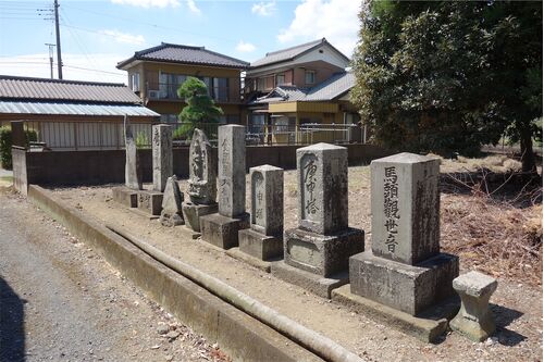群馬県邑楽郡明和町千津井の三嶋神社(訪問日:令和5年8月3日) 社殿の左側に石仏石塔の並ぶスペースがあります。向かって右のものから掲載します。馬頭観音塔(馬頭観世音塔)① 刻銘「天保十三寅年三月吉日(1842) / 上刕邑楽郡千津井村 / 世話人 村中若者 …