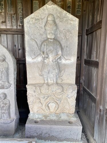 茨城県猿島郡五霞町釈迦2314の釈迦新田共同墓地前(訪問日:令和4年8月16日) 大字前林との境にある釈迦新田共同墓地の入り口前にこけら葺きの小堂が建立されており、中に2基の石仏がお祀りされています。向かって右が青面金剛を刻んだ大型の庚申塔、左が上…