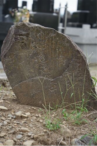 長野県塩尻市洗馬の共同墓地(訪問日:2024年10月3日) 墓地の片隅に庚申塔がおかれています。塔身は斜めになり、下部は地面に埋没しています。文字庚申塔 刻銘「貞享三丙寅歳十月日(1686) / 奉造建庚申塔」 自然石型、彫像(日天月天) 墓地の所在地