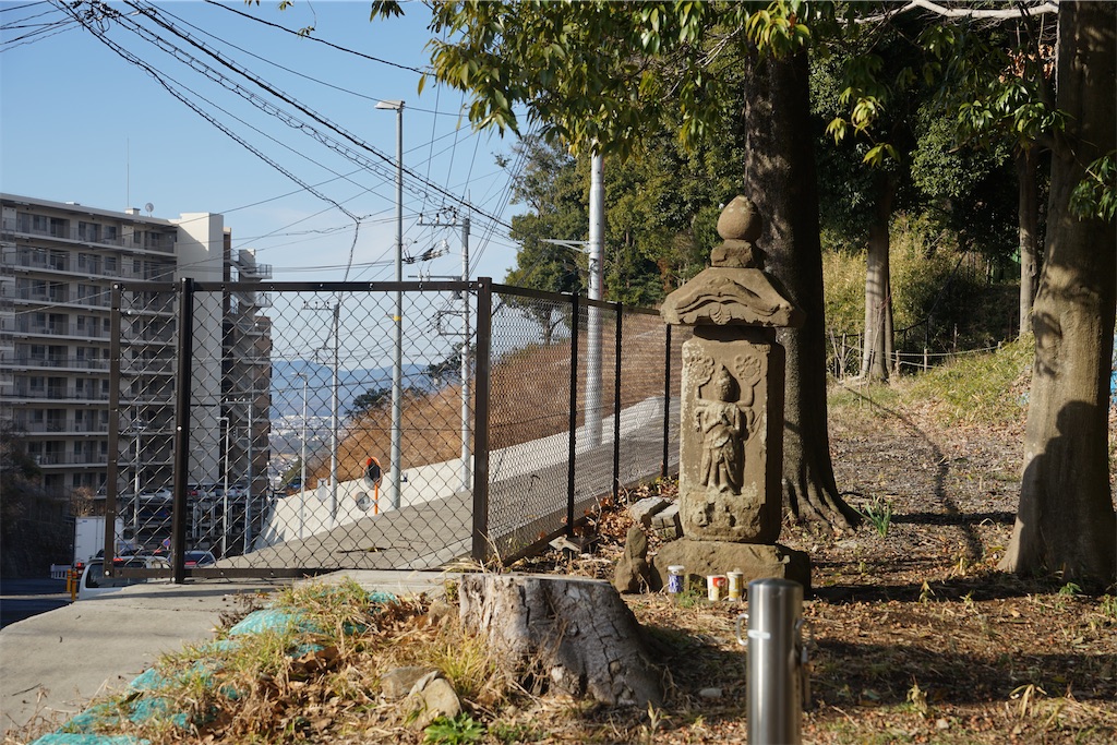 県立座間谷戸山公園内に鎮座する三峰神社の参道入口脇に庚申塔が佇んでいます。工事の関係で塔身や笠部がバラバラで倒伏していましたが、最近になって再び本来の姿に戻されました。