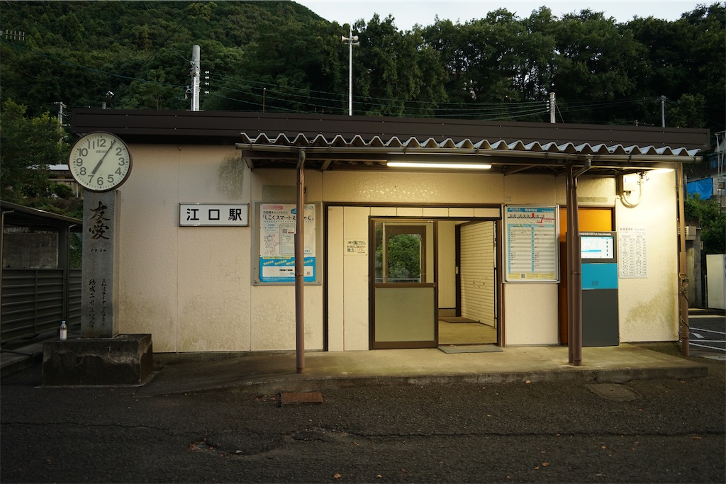 2024-08-27 江口駅 駅めぐり #3 駅めぐり 徳島県三好郡東みよし町中庄の江口駅(訪問日:2024年8月10日)日が完全に没する前に訪問。待合室前には1984年に三加茂ライオンズクラブ結成二周年記念として建てられた時計台があります。待合室。ベンチが数台のみの簡易的なものです。駅名標島式ホーム。駅舎裏の地下道を通ると着きます。向かって左が徳島方面、右が阿波池田方面の線路。 駅の所在地