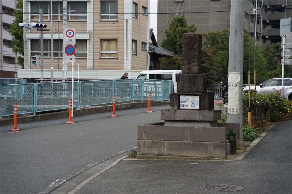 府中街道沿い、二ヶ領本川に架かる小泉橋の近くにコンクリートブロックの囲いに護られた立派な石塔が建っています。