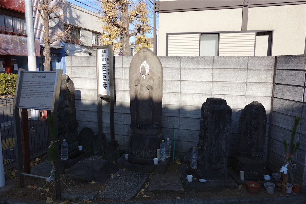 野沢通り沿い、寿福寺前バス停から北東にやや行った地点に石仏群があります。これらは「宿山の庚申塔」と呼称されるものです。宿山(しゅくやま)というのは当地にあった荏原郡上目黒村の小字名です(関東小字地図 より。2025年1月3日参照)。