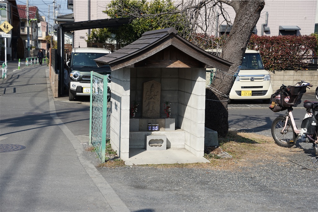 2025-01-31 東京23区の庚申塔 #238(世田谷区北烏山1丁目・小堂) 東京都の庚申塔 東京都世田谷区北烏山1丁目の小堂(訪問日:2025年1月23日)区立武蔵丘小学校の近くの駐車場にお堂があり、中に庚申塔を祀っています。青面金剛像庚申塔 刻銘「安永九子十一月吉日(1780) / 願主市郎右衛門世話人嘉兵エ折右衛門」御尊容(立像、合掌一面六臂、駒型)、その他像容・彫像(日天月天、瑞雲、三叉戟、矢、宝輪、弓)一邪鬼像と三猿像堂内に「いのってます。のぞんでます。」と記されていました。詳細は不明です。 小堂の所在地