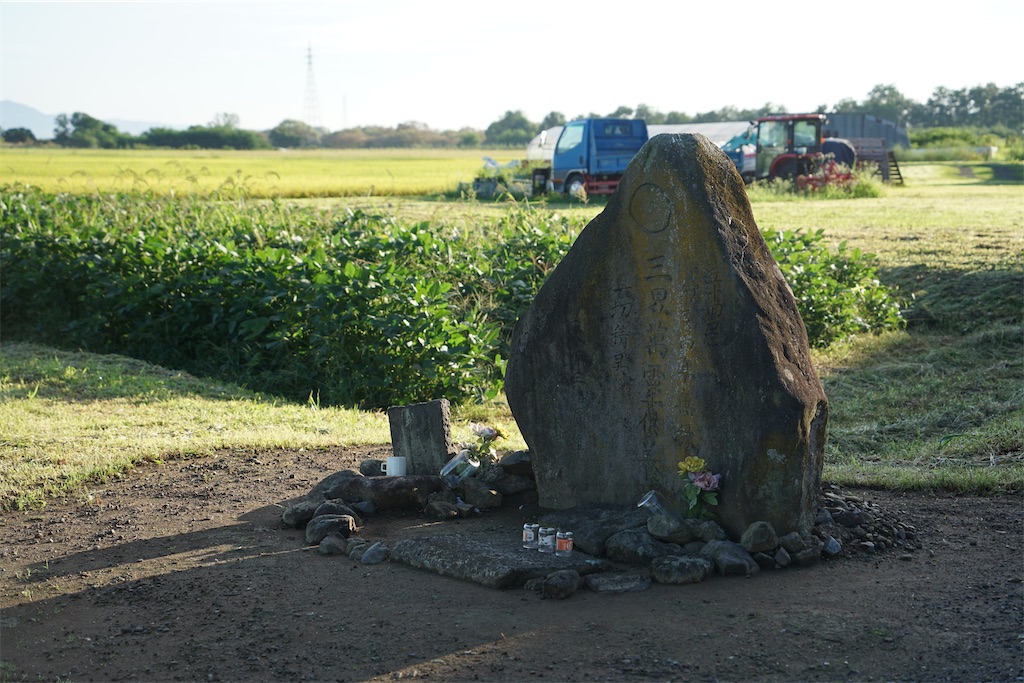 2025-05-12 天明飢饉供養塔(弘前市船水3丁目・路傍)津軽地方の天明飢饉供養塔 #63 天明飢饉供養塔 青森県弘前市船水3丁目の路傍(訪問日:2024年9月1日)集落の道の中途にある地蔵堂を右手に曲がると田畑の前に大きめの石塔が置かれています。飢饉供養塔です。 資料によると本塔は戦中の1942年に区画整理のため数メートル北東から移されたそうです。元はこの近くにイゴク穴があったのでしょうか。天明飢饉供養塔 刻銘「天保三壬辰年(1832) / 船水村中 / 五十回忌卯辰两年無縁一切精霊 / 三界萬霊供養塔」 自然石型、彫像(円相) 上部が欠失した舟形光背型地蔵菩薩塔もありました。 所在地