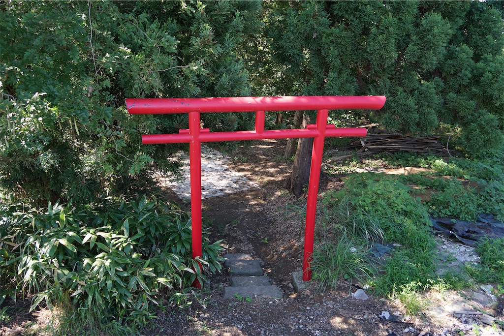 県道39号線 長平町森田線を挟んだ狄ヶ館溜池洪水吐ゲートの向かいに、道路より若干海抜の下がった場所があり、そこに赤い鳥居が建てられています。